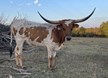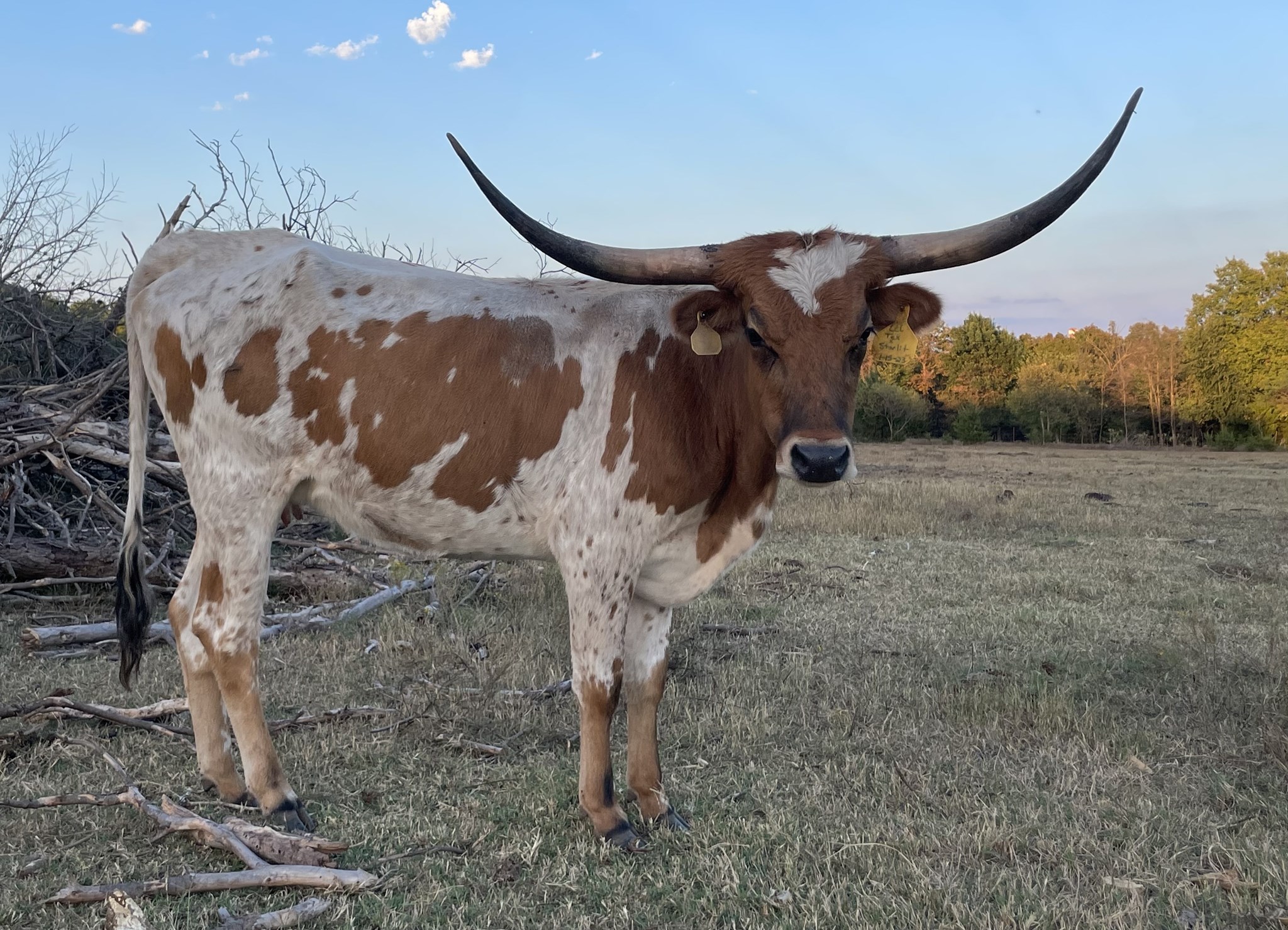 **pending** Don’t overlook this girl! She has a smaller frame but just take a look at her pedigree. She has the traditionally slower growing dark horns but they are really starting to push out there! She had a knockout 11/2024 black and white speckled colored calf that we are retaining. She is being exposed back to our herd sire Kid Rock 2/1.