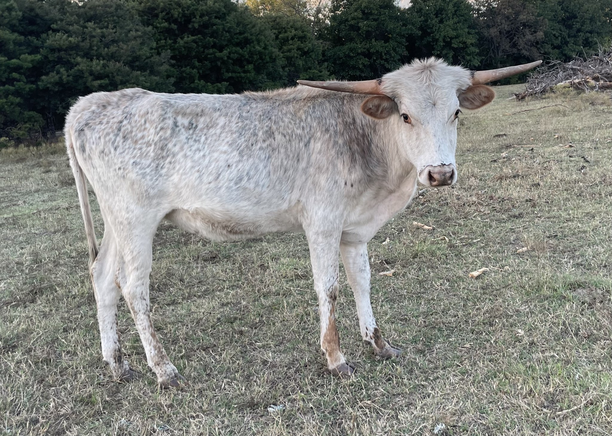 ***SOLD*** She will have some twist in her future! Don’t let her white color fool you - she has color coming under that white. Check out her pedigree with the great Premier Longhorn genetics on bottom and Kid Rock 2/1 (Mr Happy x Jest Dragging Iron) on top.